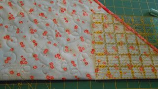 Take your quilted and bound piece and fold it in a triangle. I am going to refer to the fabric for the outside as the "right side". Make sure the right sides are together.